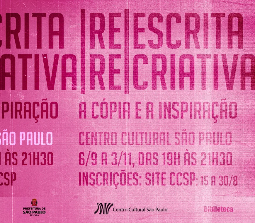 Entre os dias 15 e 30 de agosto, abrem as inscrições para a próxima rodada do curso de Escrita Criativa que organizo no Centro Cultural São Paulo. Como das vezes anteriores, pensaremos a escrita a partir de práticas variadas: da ficção literária ao meme, da poesia visual ao slogan publicitário, do détournement ao hipertexto.