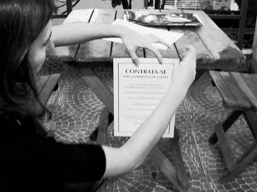 Numa mesa que poderia ser de bar, Marina atendeu curiosos, surpreendidos com a oferta de compra de um dia de trabalho. Entre a clínica, o boletim de ocorrência e o confessionário, propôs um contrato visual indecente, porque exigia a troca de um dia de produção por uma jornada de comunhão. E quem acredita.